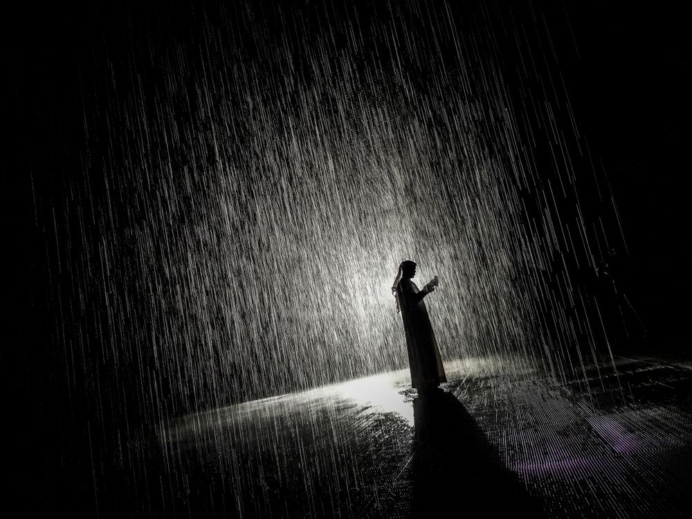 A man wearing the traditional Arabic dress takes a photo with his cellphone inside the Rain Room, an immersive installation that invites you to walk through a downpour of continuous rain without getting wet