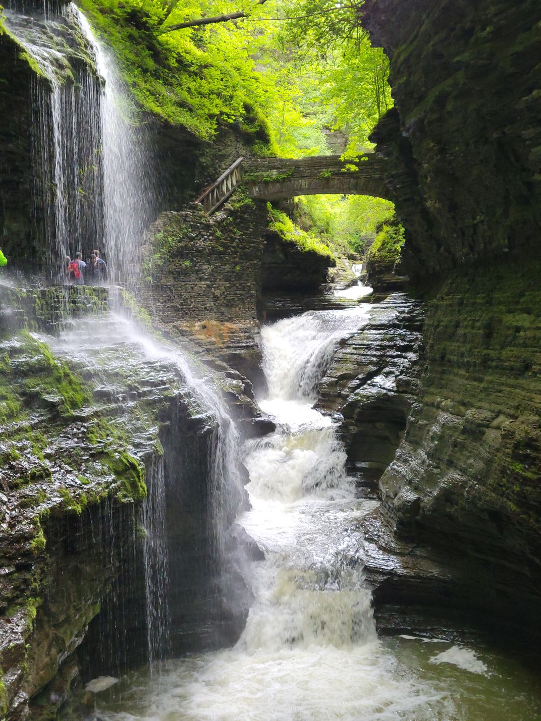 The bright white water of Rainbow Falls contrasts against moss-covered canyon walls, while fresh spring foliage softens the dramatic stone layers above. It’s a classic Watkins Glen view that feels alive with movement and color.