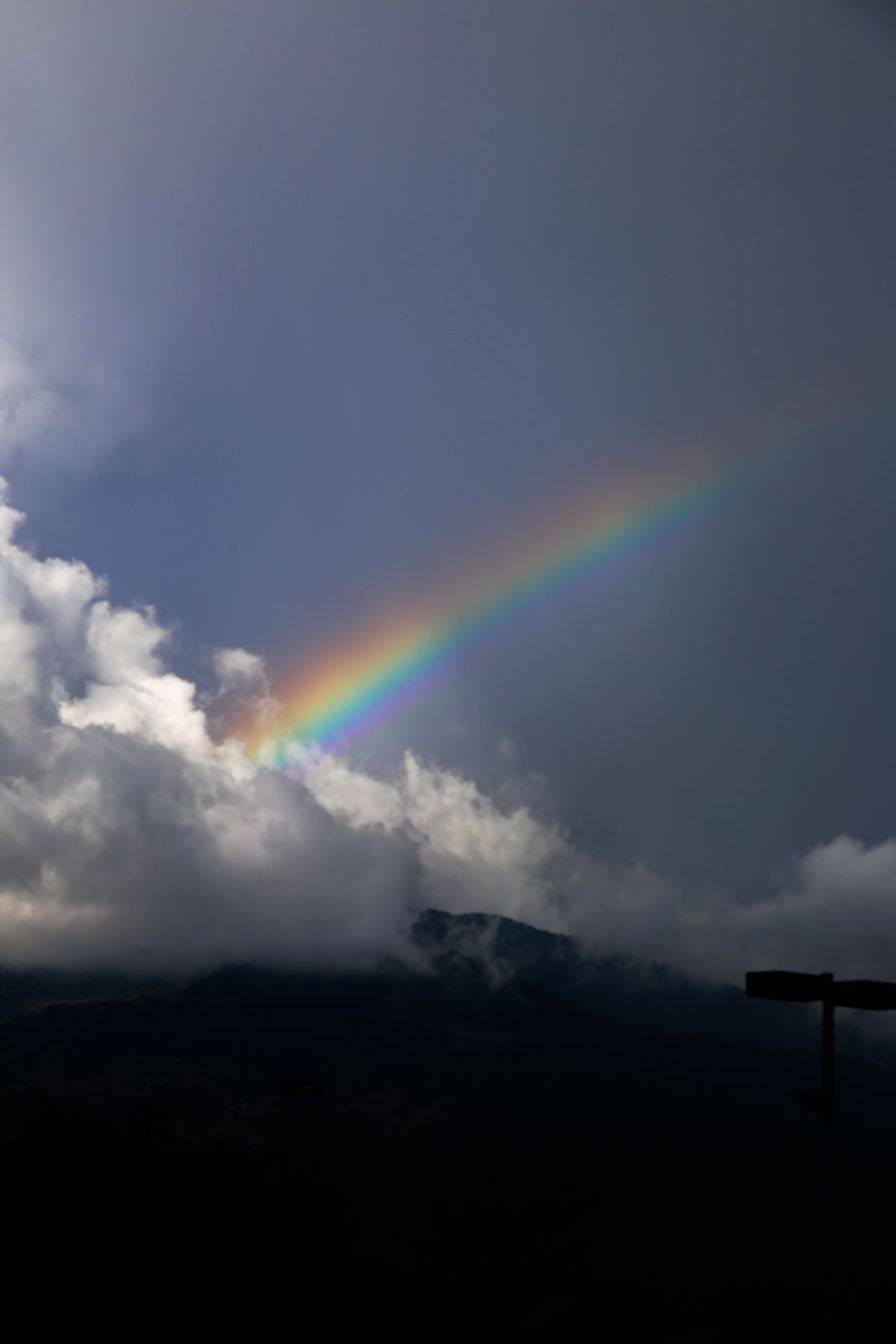 A vibrant rainbow bursts through dramatic, heavy clouds over Hehuan Mountain in Taiwan. The contrast between the dark, stormy sky and the brilliant spectrum of light captures the breathtaking and fleeting beauty of this high-altitude landscape.