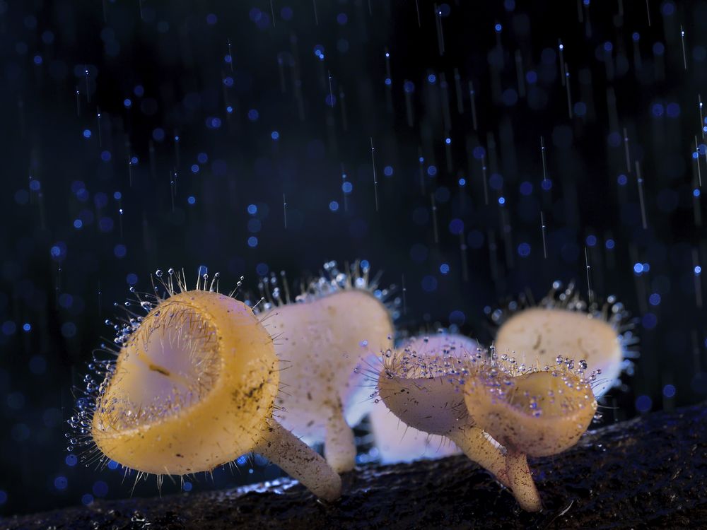 Delicate cup fungi rise from the damp forest floor, their fine hairs adorned with sparkling droplets of rain. Each drop clings like a tiny crystal, refracting the blue tones of the night and turning the fungi into living ornaments of the rainforest. The backdrop of streaking raindrops adds rhythm and movement, contrasting with the fungi’s fragile stillness. The scene feels like a glimpse into nature’s hidden jewelry box, revealed only under the rain.