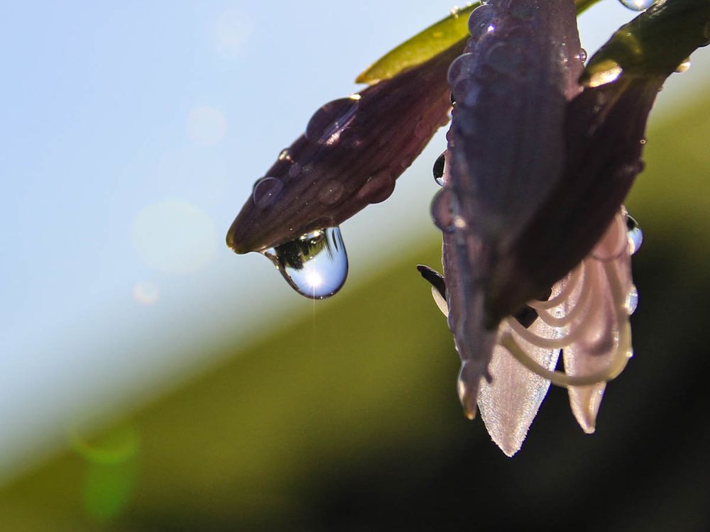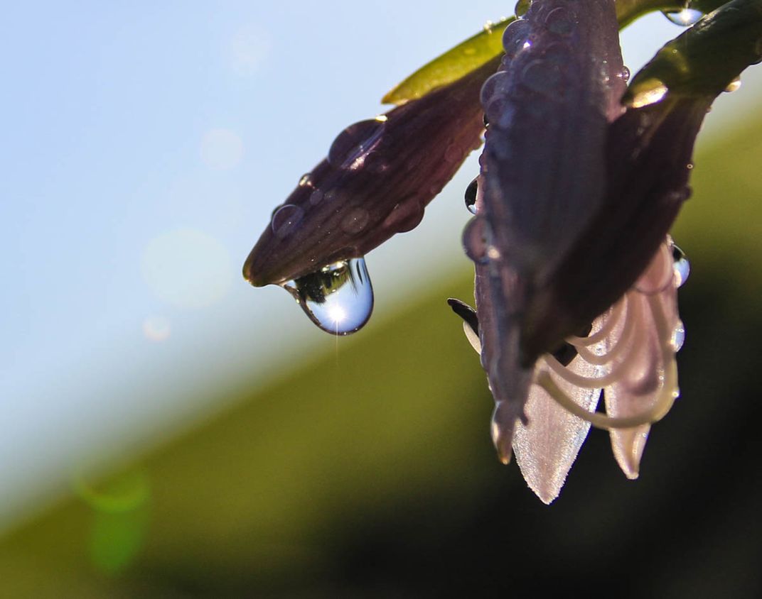 This is a hostas flower in my yard surrounding my koi pond. I thought the storm may have ruined it, but turned out to have some wonderful raindrops hanging from it.