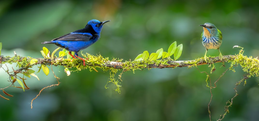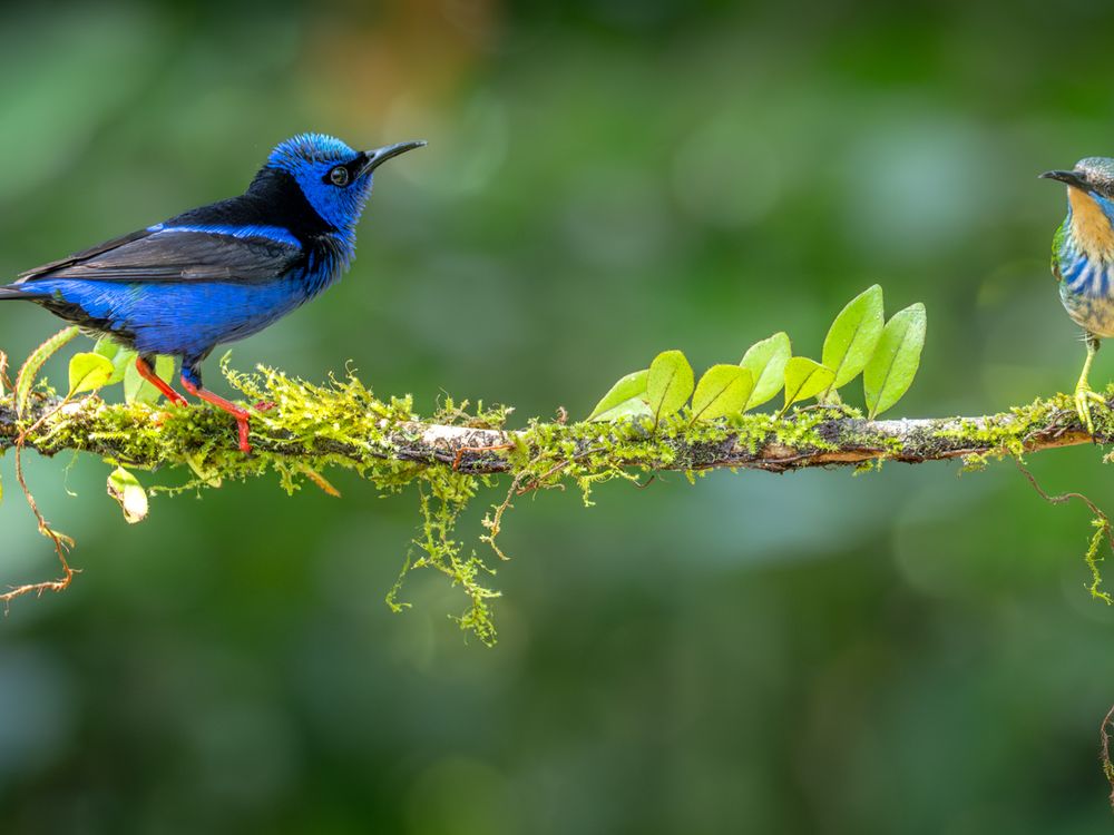 Two brilliantly colored birds perch on a rain-kissed mossy branch in Costa Rica, their vibrant blues and greens glowing against the soft, misty forest.