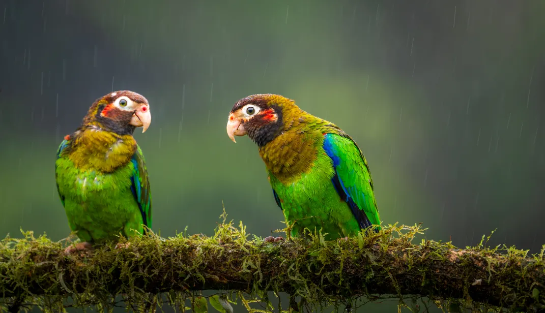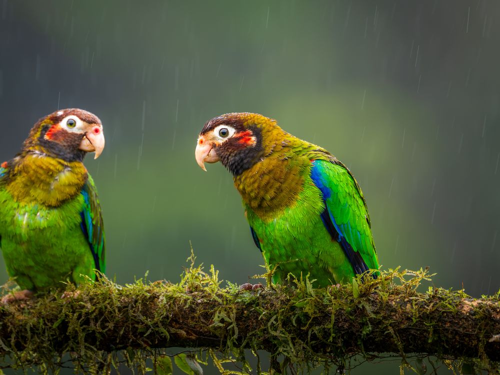 wo vibrant parrots perch on a mossy branch in the Costa Rican rain, their green feathers glowing against the soft, misty backdrop as they huddle close, sharing a quiet moment in the rainforest.