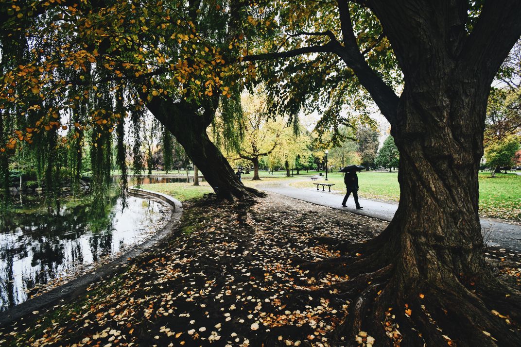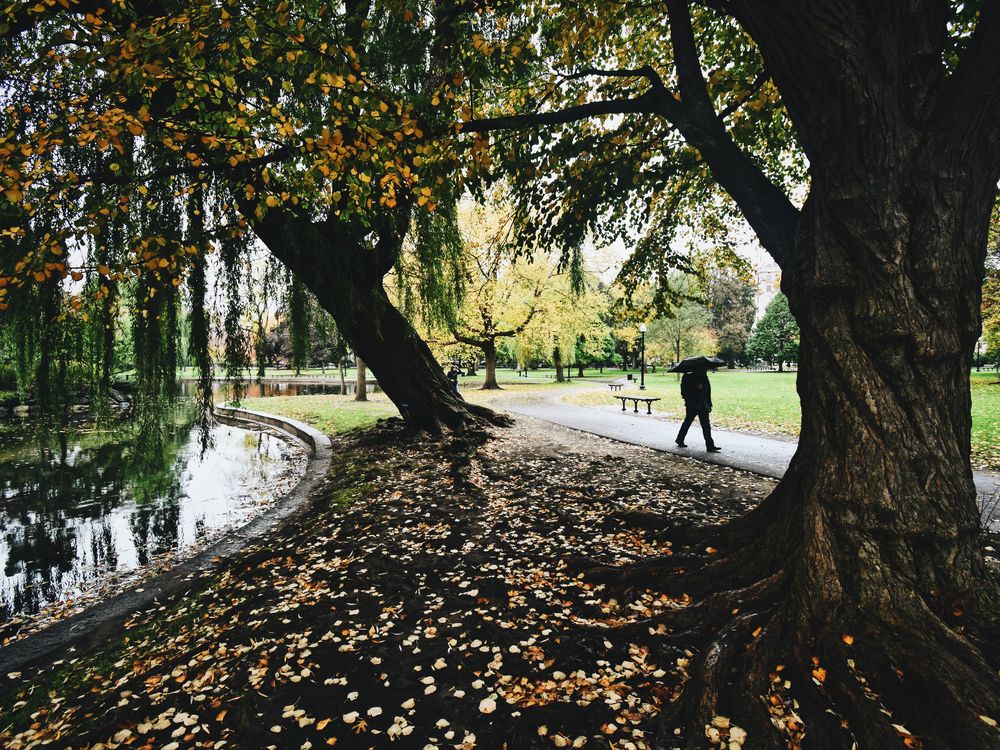 In the center of Boston, a stranger protects himself from the winter rain as he walks through the commons.