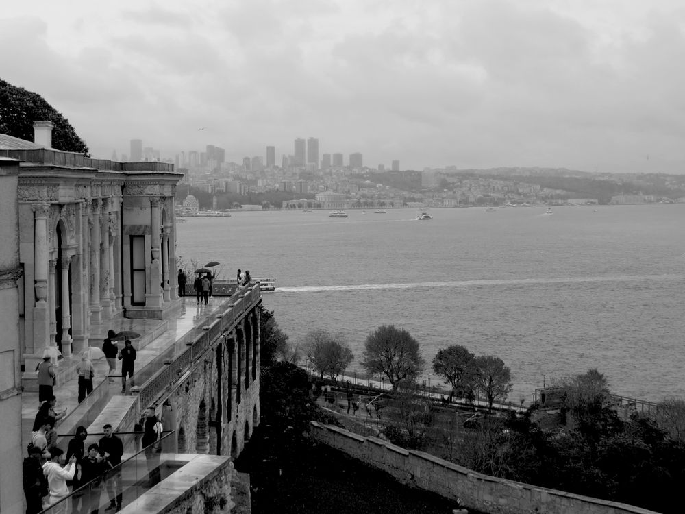 The view from Topkapi Palace in Istanbul on a rainy day. The contrast between the historic building and the new city on either side of the Bosphorus Canal.