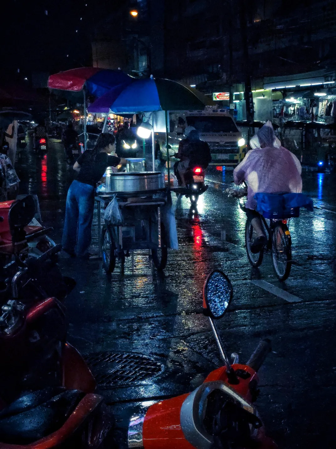 In the night market streets of Bangkok, Thailand, despite the heavy rain, all sorts of people continued to work and go about their business.