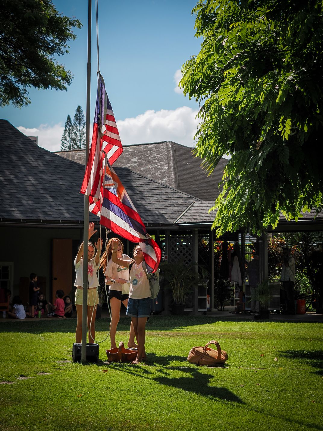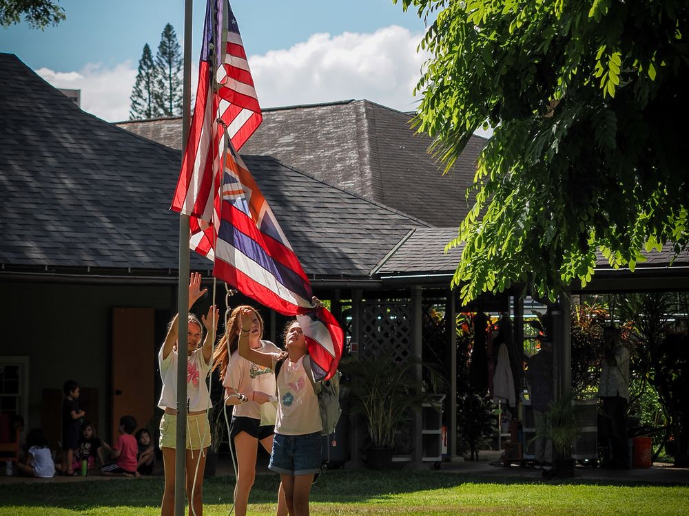 Three six-grade girls raise the American and Hawaiian flags at the start of the school day.