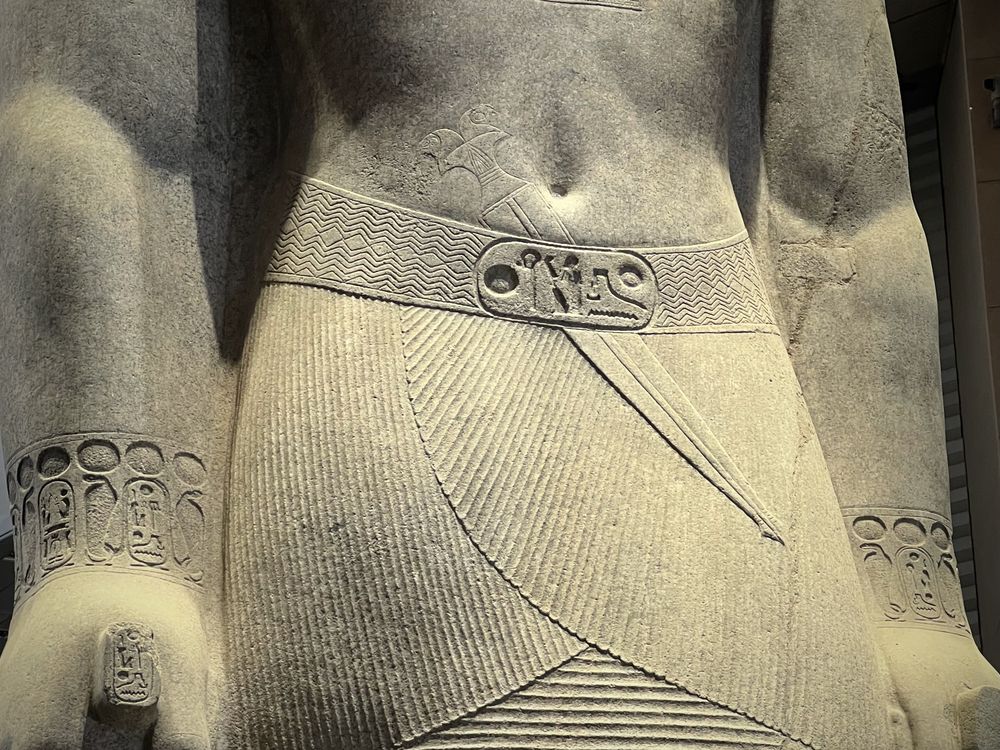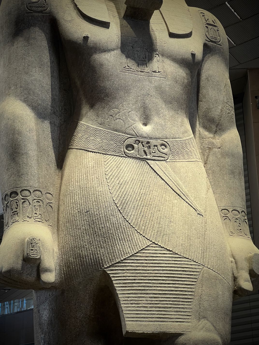 A close-up view of the sculpted torso of the colossal statue of Pharaoh Ramses II, located at the Grand Egyptian Museum in Egypt. The photo highlights the detailed hieroglyphs, carved sash, and textured stone surface of the ancient artifact.