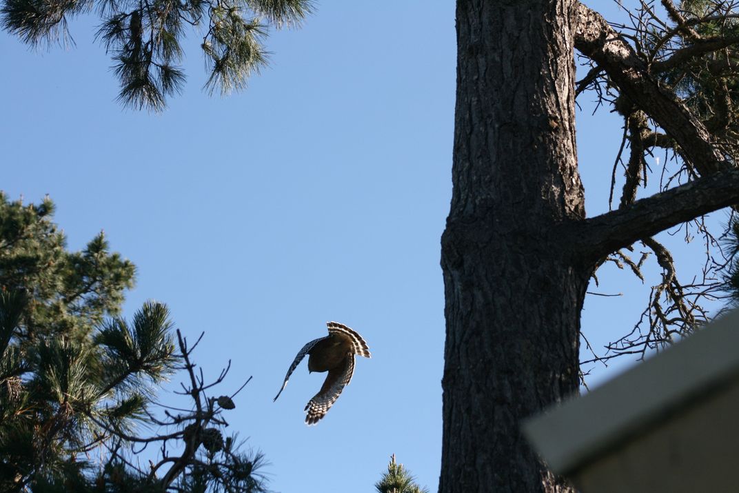 One of two mating Red-shoulder hawks taking flight directly overhead.