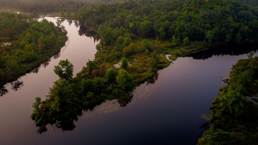 I captured this drone image of the Raquette River in the Adirondacks in New York state while collaborating on a short film about Sky Woman from Haudenosaunee traditions. The light from the sunrise gives deep indigo and warm purple tones to the water and flora.