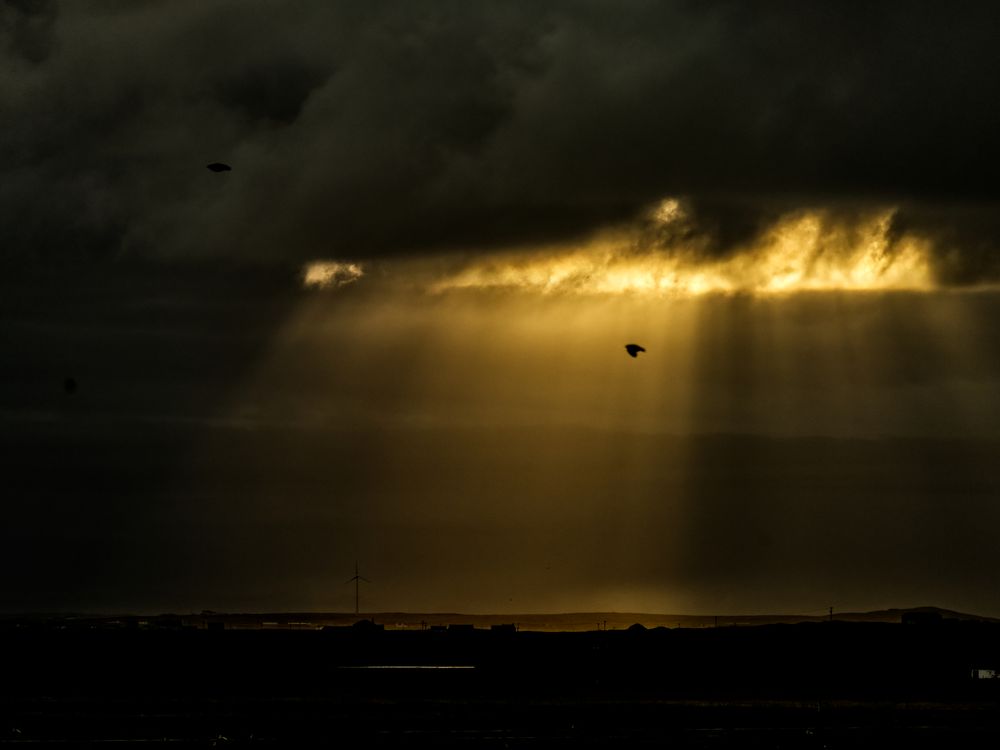 A break in the clouds of the Scottish sky lights a bird in flight.