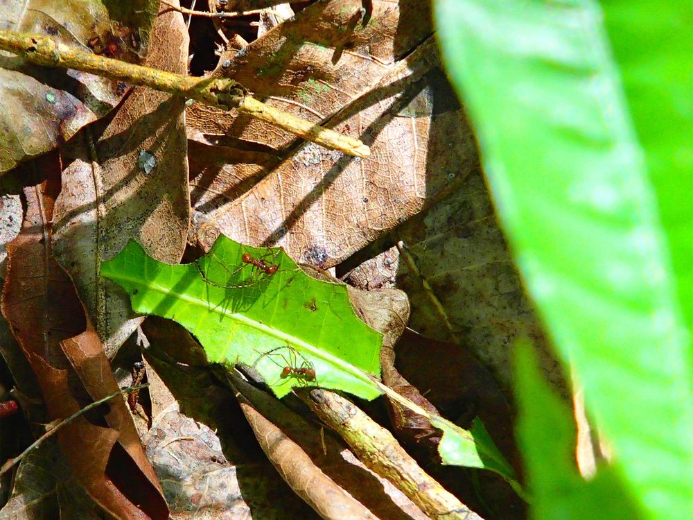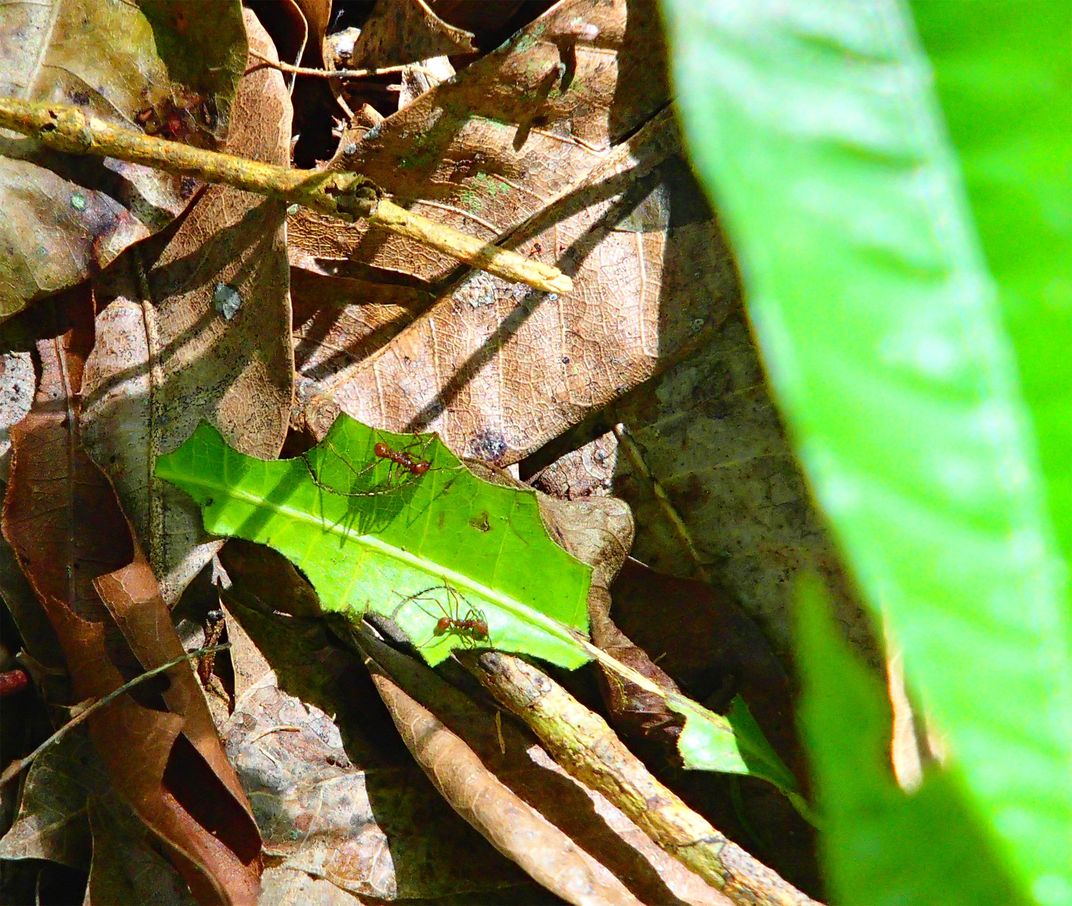 I saw these two ants in the jungles of Belize. They were part of an efficient system: cutting out small parts of leaves and taking them back to their anthills in an elaborate highway system.