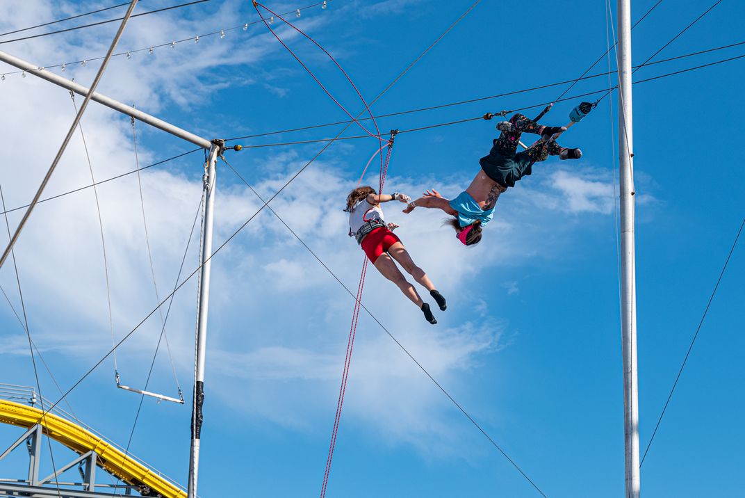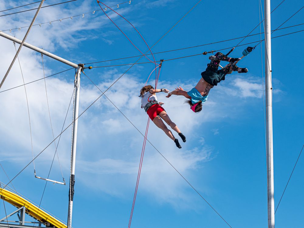 A man and a woman on the trapeze equipment at the Santa Monica Trapeze School assist each other as they reach out high in the sky.