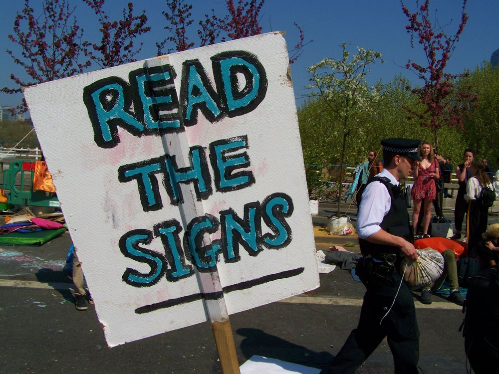 Read The Signs; Police remove Extinction Rebellion climate change protesters from Waterloo Bridge, London.
