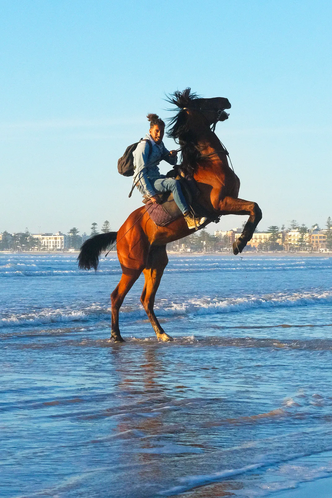Essaouira, Morocco, is known for strong winds and its many surfers flocking the beach, but it's also a place where camels and horses hold a significant presence. As I walked along the shoreline, a group of young men on horseback approached me and followed me for a while, eager to convince me into doing one of their guided tours. They were showing off their skills, including impressive stunts like rearing up on their hind legs. Although I chose not to participate in any horseback riding, I saw my opportunity in photographing more than just the typical tourist experience. Instead, I believe the photograph shows the essence of Moroccan youth and culture in a more nuanced and unique way.