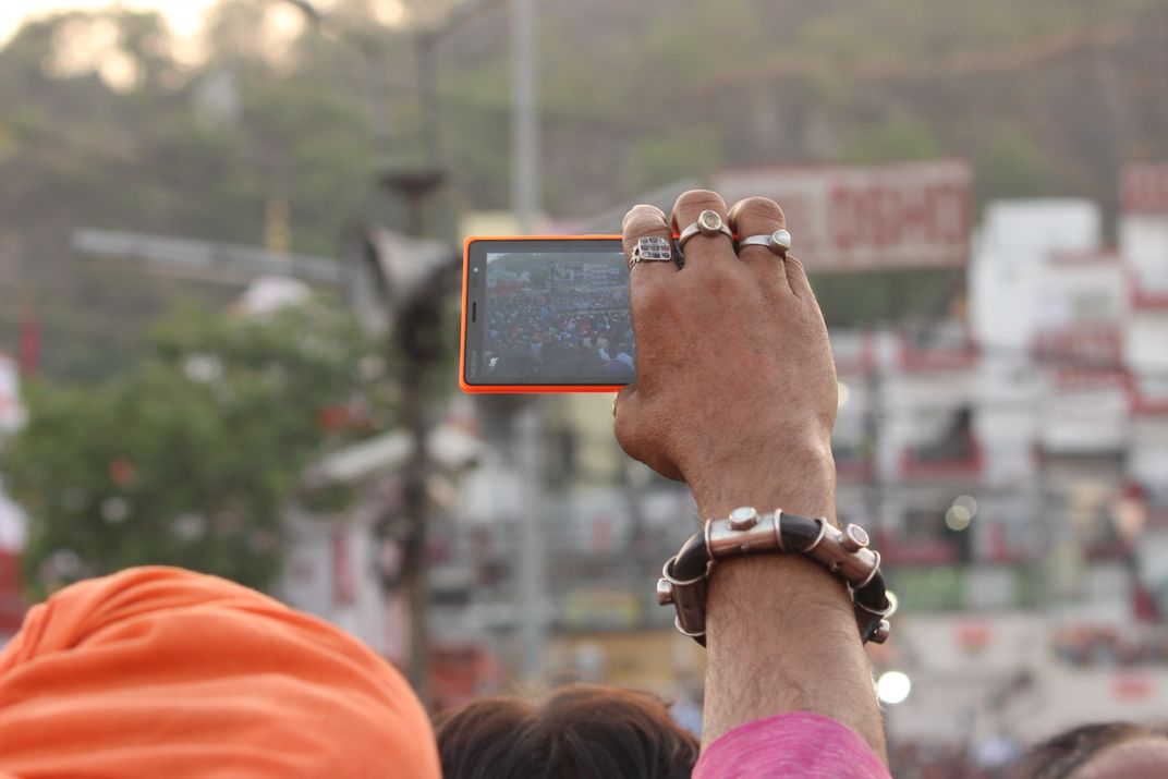 Recording for posterity A 'Sadhu'(Hermit) video records the evening prayer on his mobile phone on the bank of river Ganges in Haridwar, India.