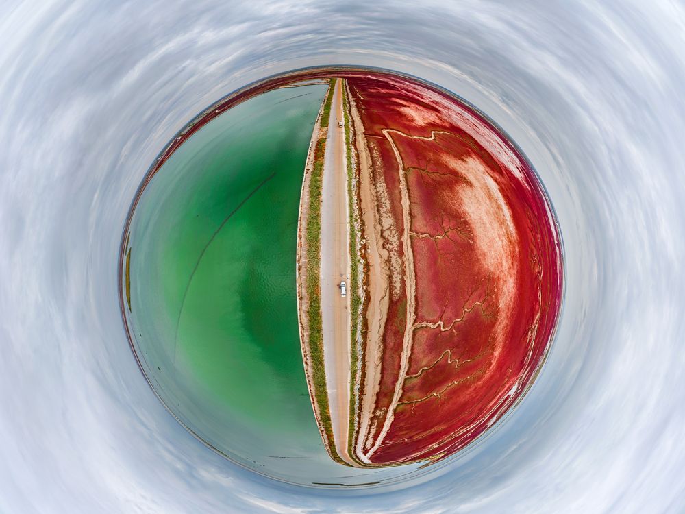 Half is a lake tinged with turquoise, half a beach soaked in crimson flames. A narrow path folds like candy paper, enclosing this clash of colors beneath the dome. Even the clouds become soft-edged, framing this slice of land like a color block plucked from a dream — audaciously vivid yet strikingly beautiful.