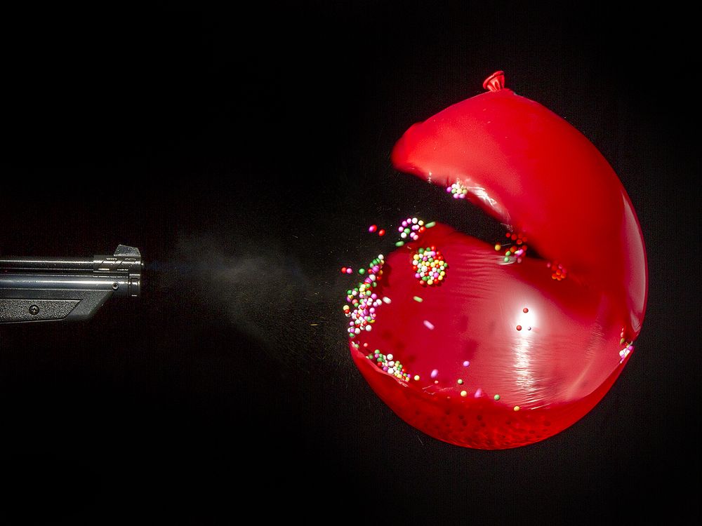 Red balloon ballistic shoot. Ballistic photo of red balloon shot with pellet. Captured this image using a co2 pellet gun, synchronized flash and target balloon.