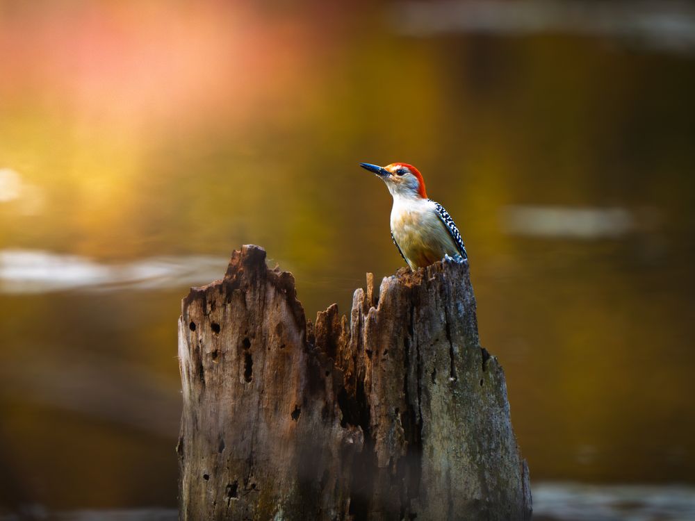 Woodpecker on a rotten stump in a small pond captured in the fall.