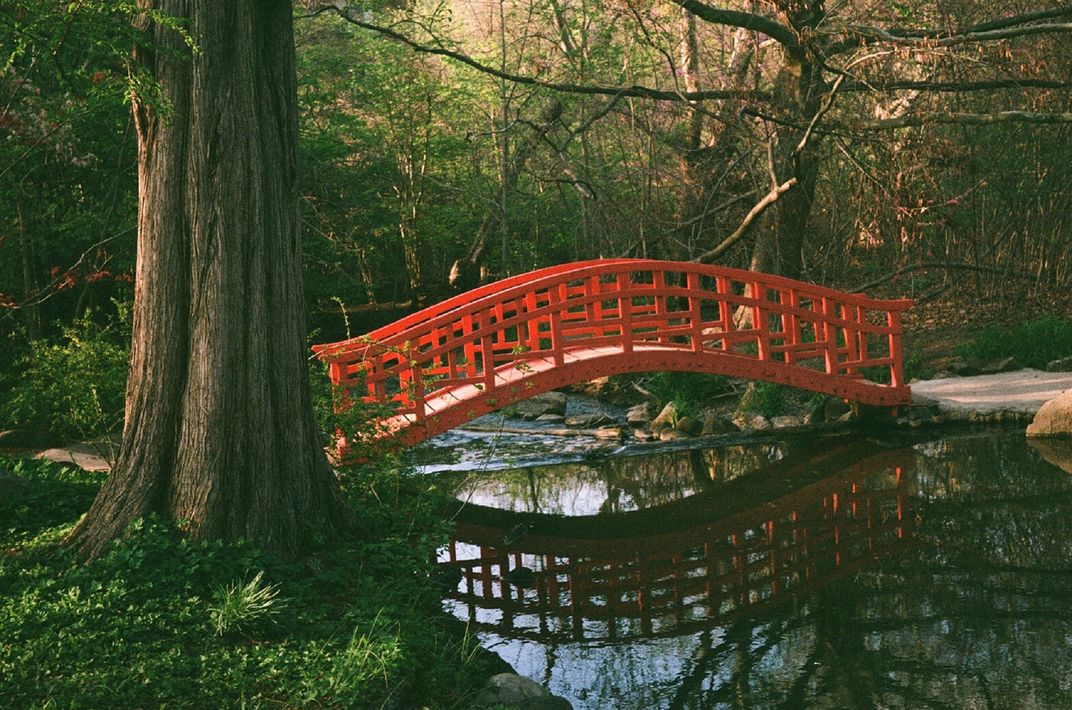 Red bridge in the Japanese Gardens of Cranbrook Gardens reflected in the water.
