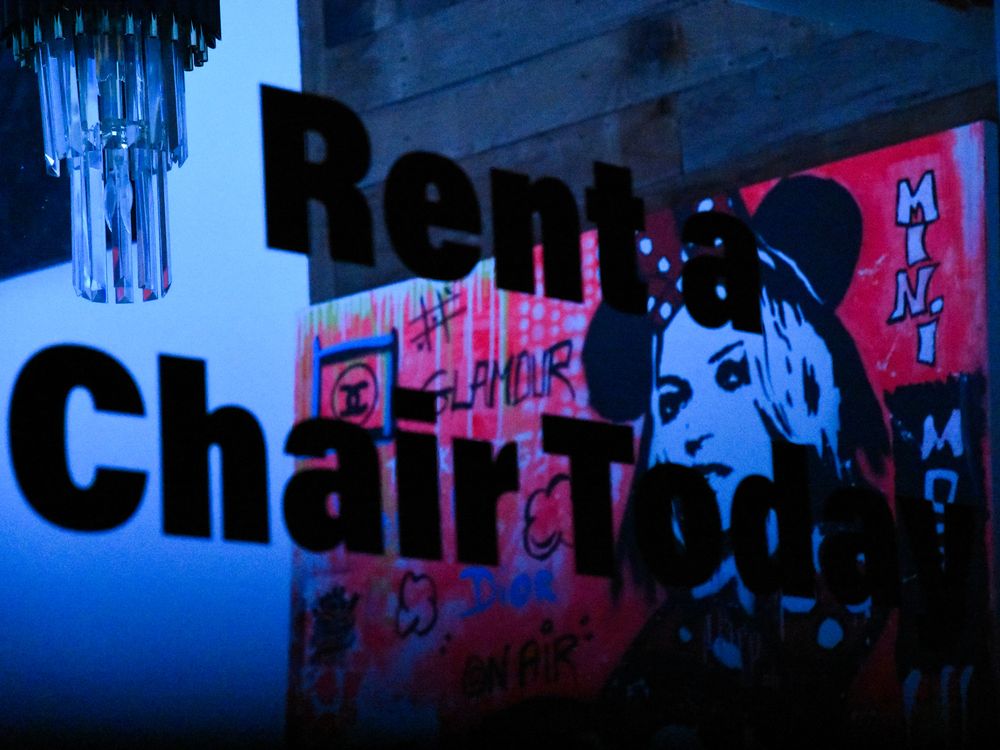 A poster peeks through a window of a hair salon in nighttime Los Angeles.
