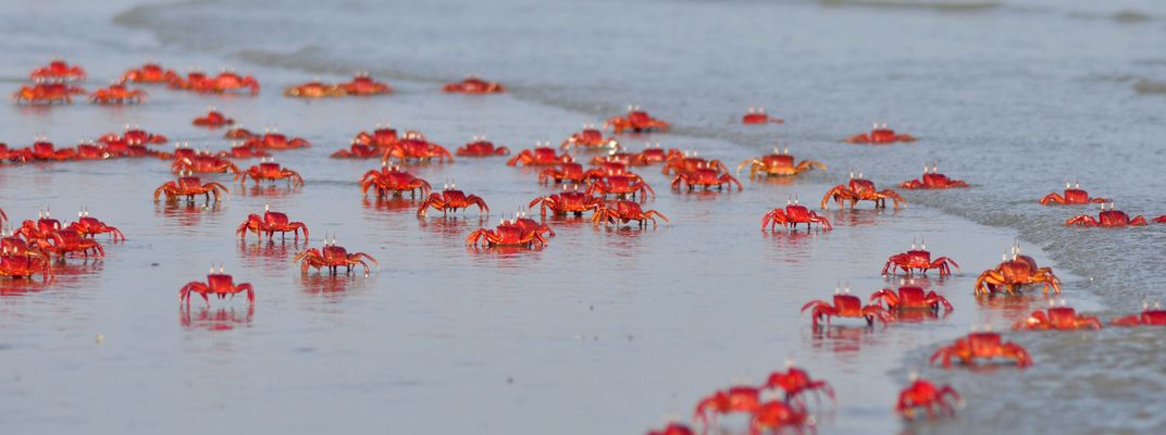 India is bordered with many seas and ocean, red crabs are very common in different sea beaches in India. This photo reflects a image of red crabs at Mandarmani beach of Bay of Bengal at Mandarmani, West Bengal.