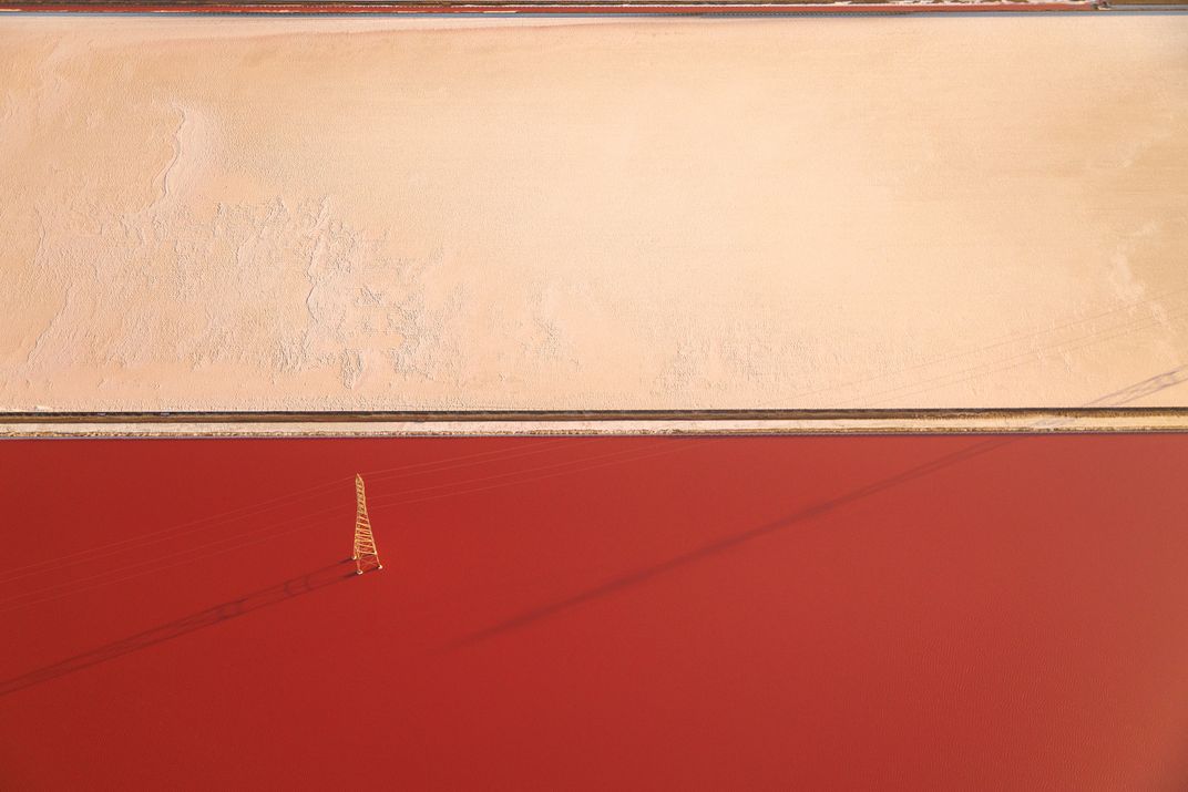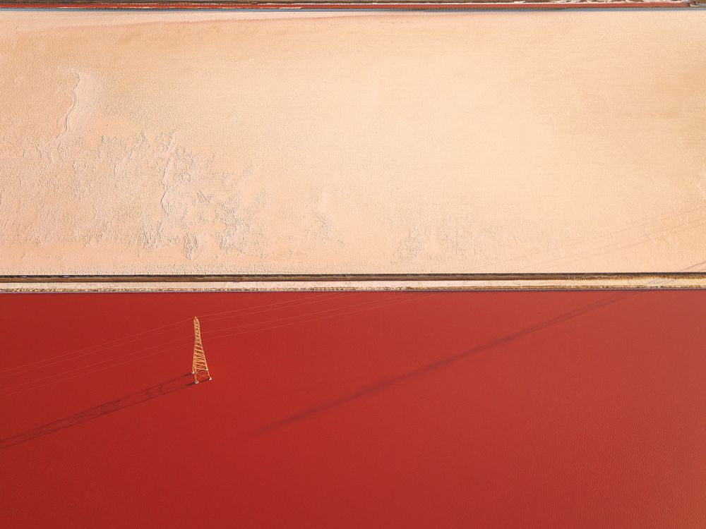 Salt ponds along the San Francisco Bay form graphic bands of white and deep red, separated by a thin industrial levee. A lone transmission tower stands in the brine, casting long diagonal shadows that cut across the landscape. Seen from above, the scene becomes a study in color, geometry, and the imprint of industry on a natural landscape.