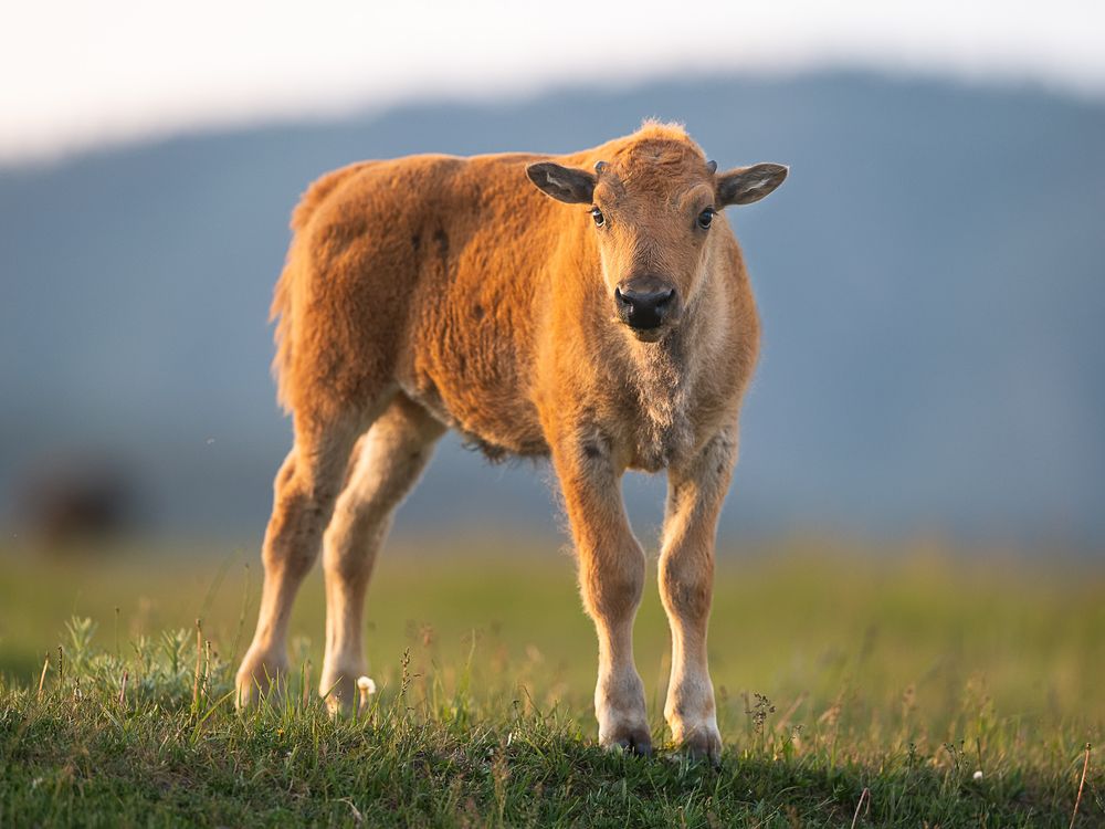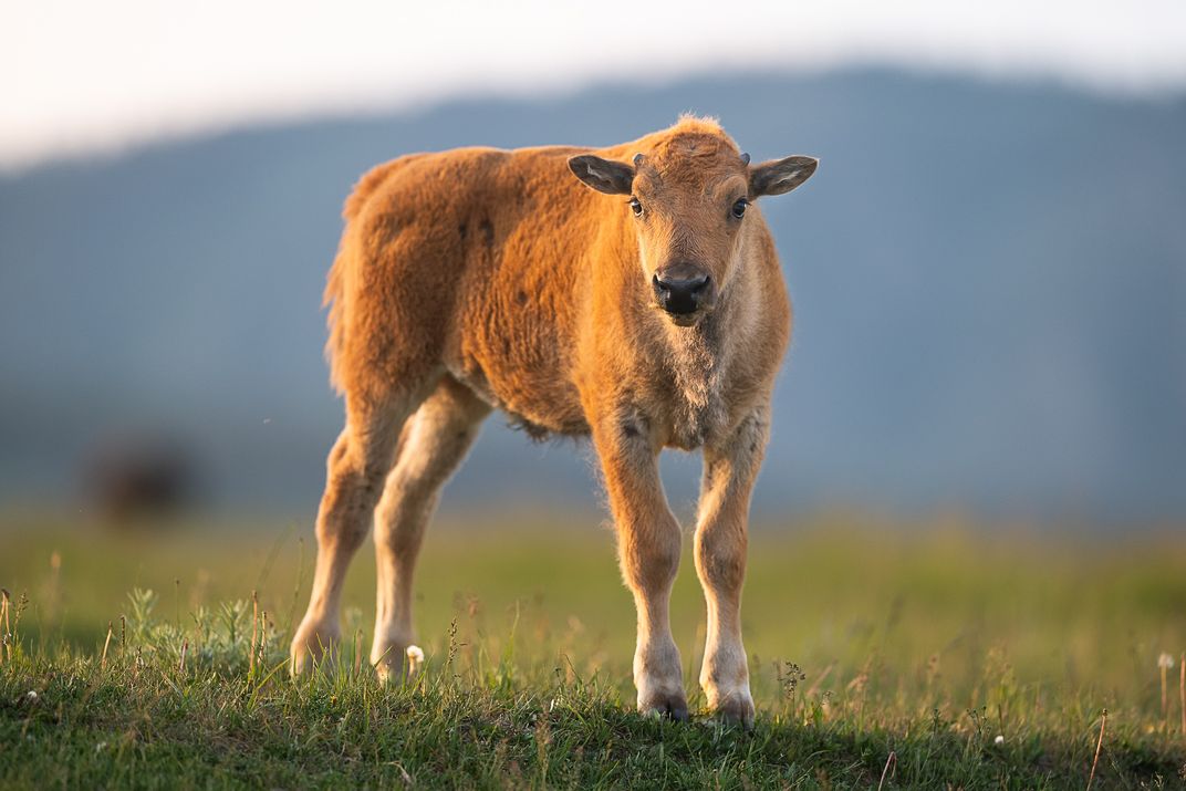A red dog, or baby bison, pauses in the last light of a warm summer evening.