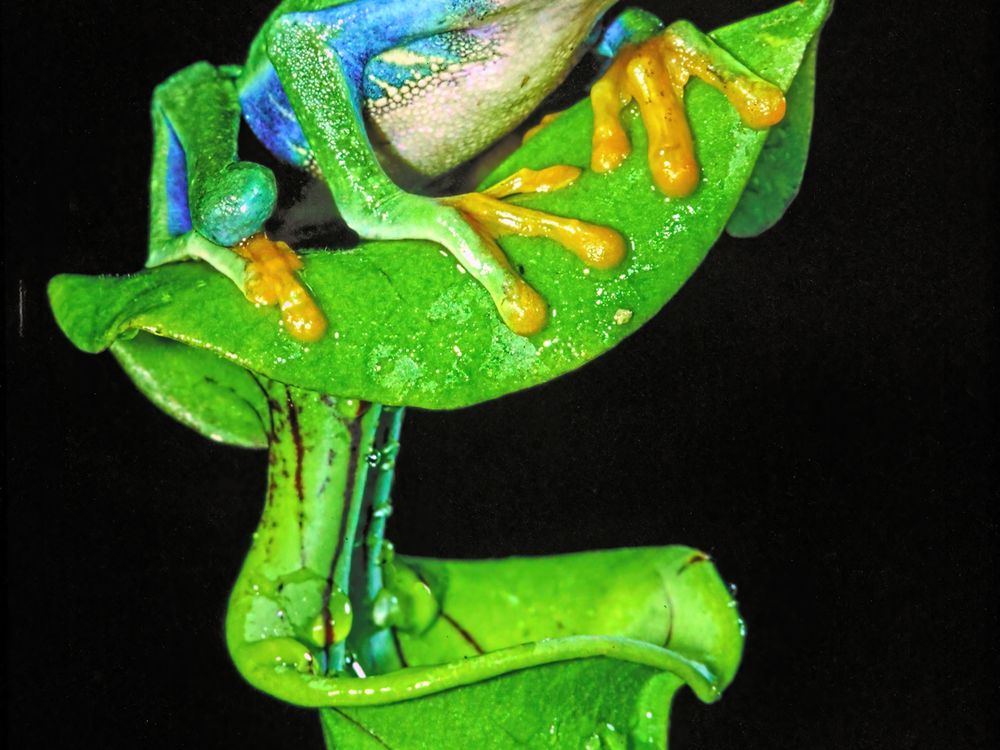 I was always keen to find and photograph red-eyed tree frogs in Costa Rica as well as the many exotic birds present in that country. To find frogs I hunted, with a guide, in the lowland rainforest of Tortuguero National Park. We spotted one nice subject in the late afternoon in relatively poor light. I used some fill-flash with a diffuser to help illuminate the subject with a dark background.