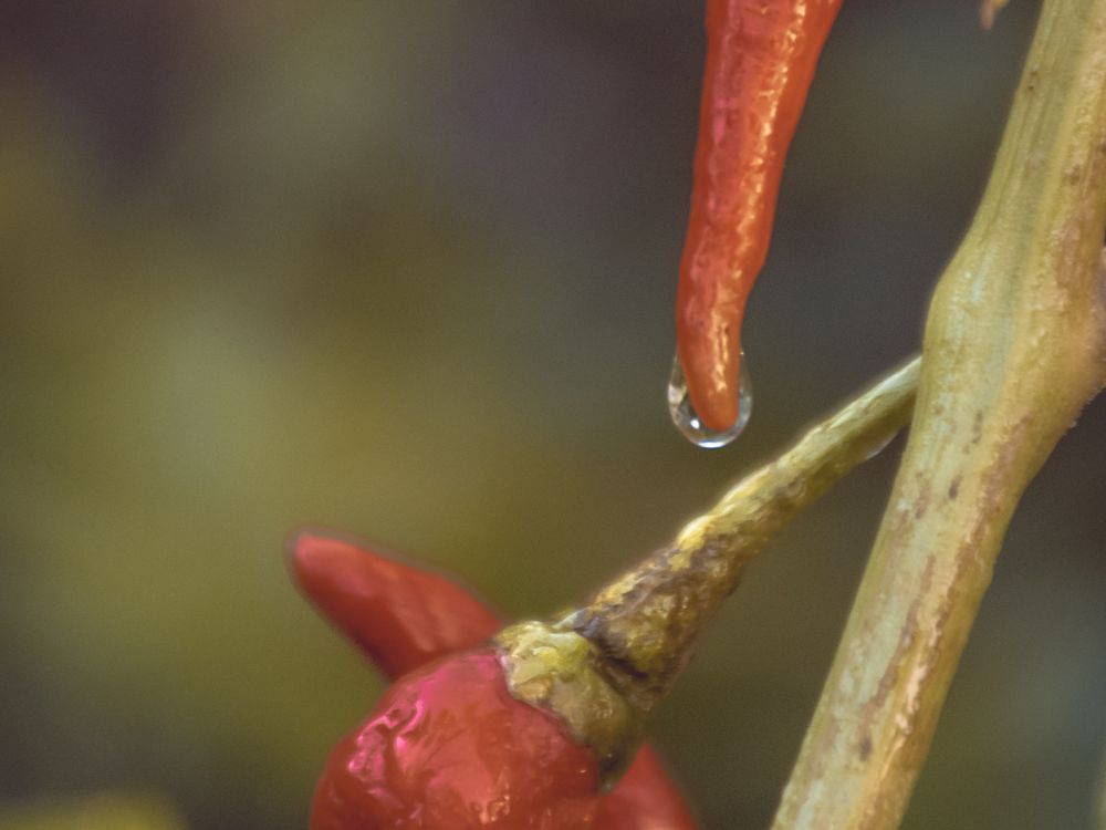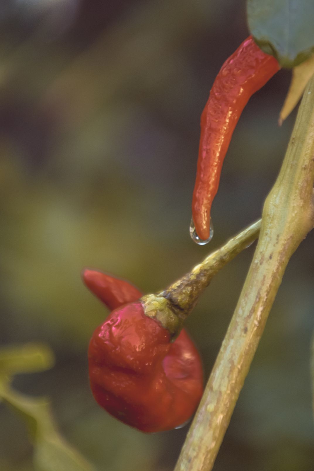 A picture of two red peppers on a tree branch. On the top of the red pepper in the picture, there is a drop of water, possibly from early morning dew, clinging to the tip of the pepper.