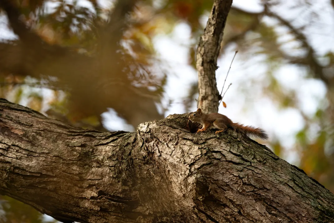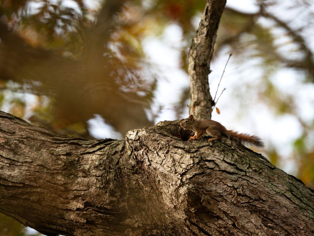 I was taking a walk around our relative's property when off in the distance I noticed the smallest red squirrel high in a tree. I was quite happy to capture it so clearly before he scurried back down the trunk.
