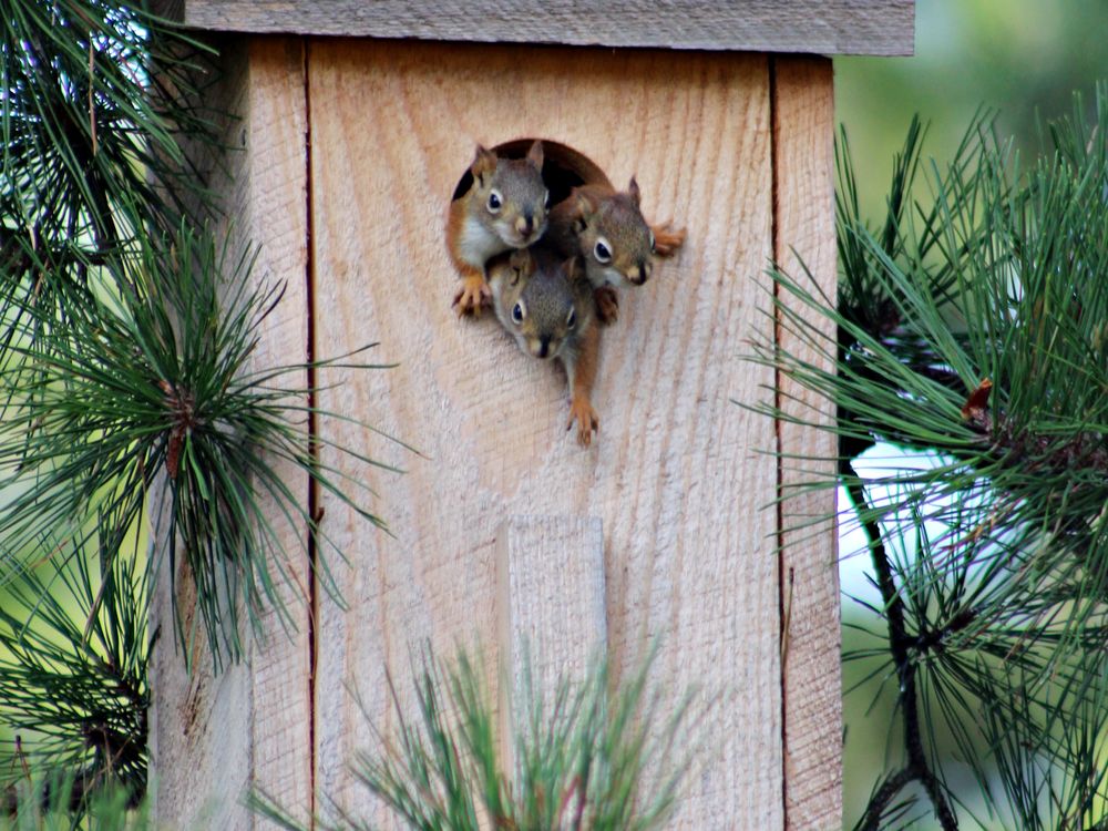 A mother and four young Red Squirrels emerge from an abandoned owl house