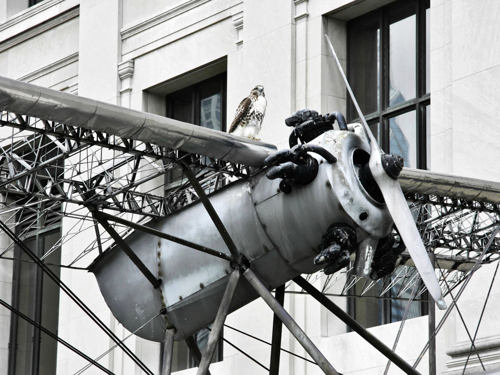 Red tailed hawk searching for a snack on the shell of a 1930's airplane at the Franklin Institute, Philadelphia.