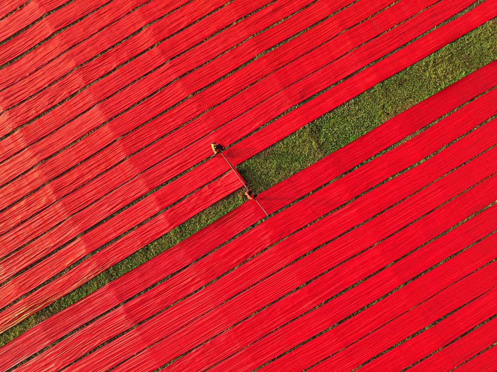 Workers stretch vibrant red cloth across open fields, capturing the timeless craft of fabric dyeing in Bangladesh. The bold lines and vivid color reflect a cultural heritage shaped by skill, patience, and generations of artistry.