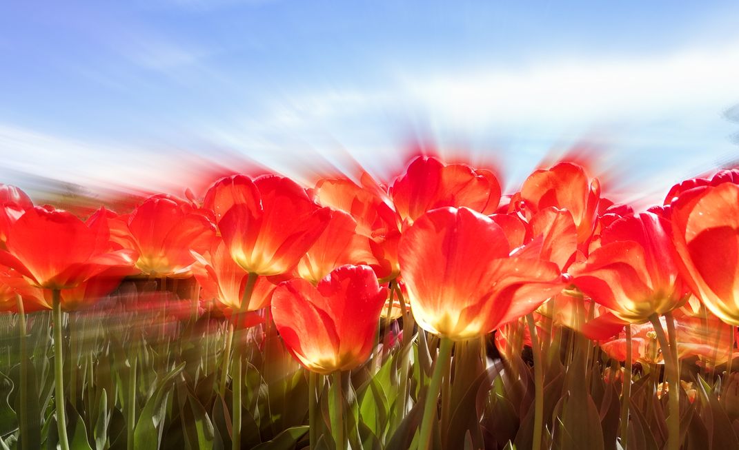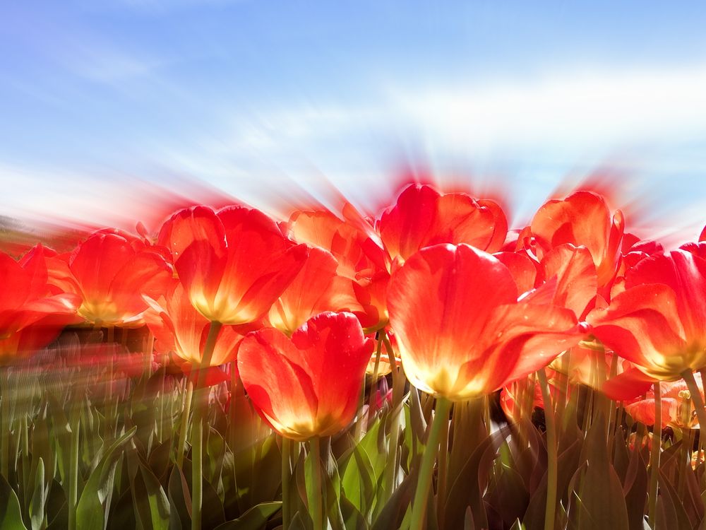 In summer a very sun-shining day the sun shines go through the red tulips with beautiful color and shape.