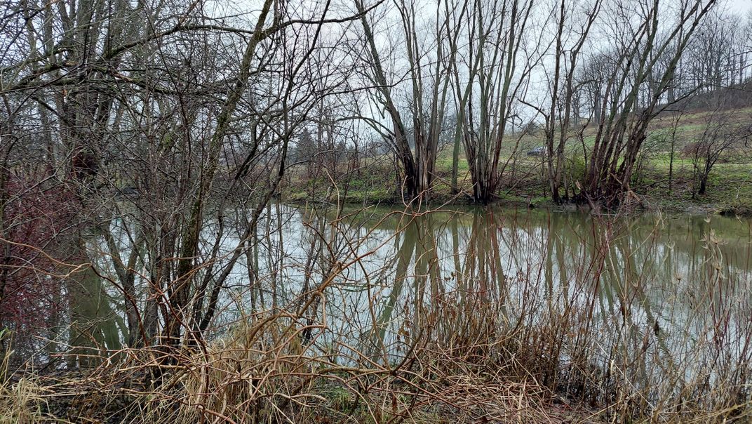 This image shows the reflection of trees in the water and was captured during a nature walk on a dreary day.
