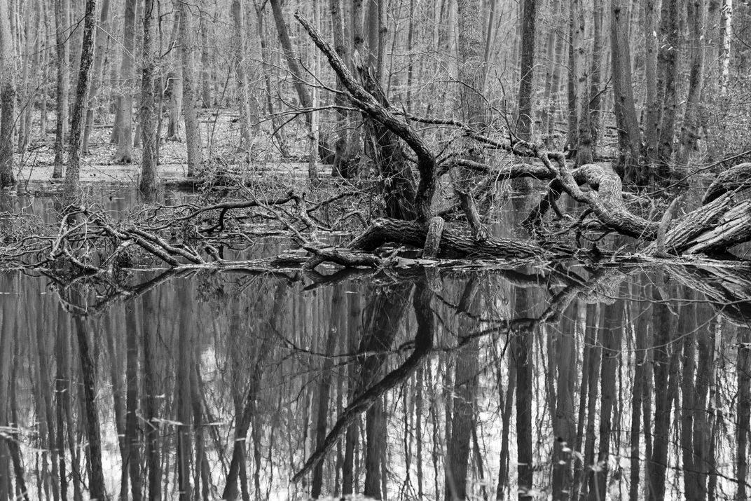 After heavy rain and some flooding, the forest near where I live was in parts devastated with a lot of dead wood in the water.