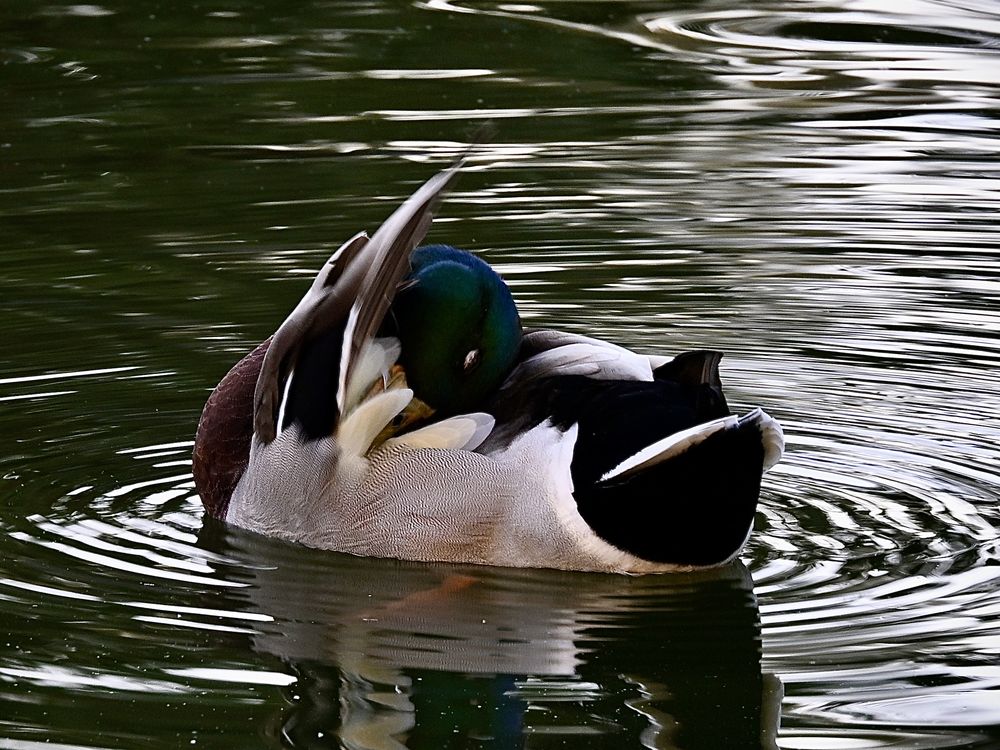 Duck fixes it feathers while the water ripples and the ducks reflection shows a glispls behind it at its feet