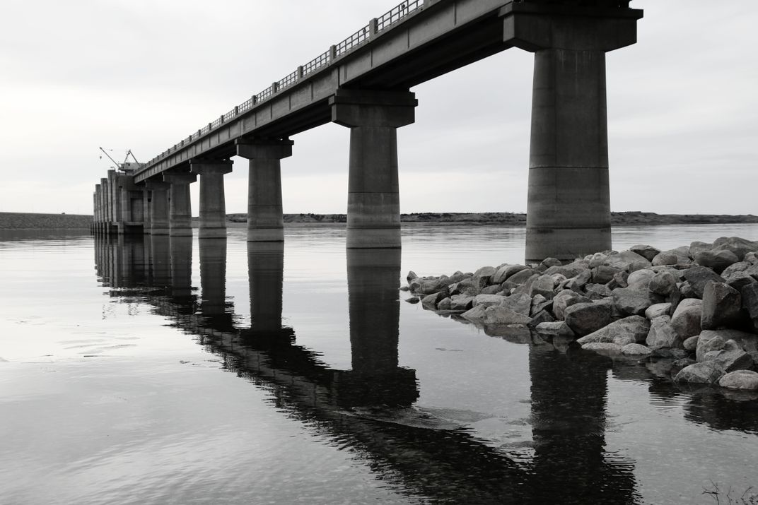 This is the water intake bridge of the second largest rolled earthen dam in the world and located in South Dakota. The intake bridge is where the water gets pulled down into and travels under the dam about 8 stories lower and a half mile away.