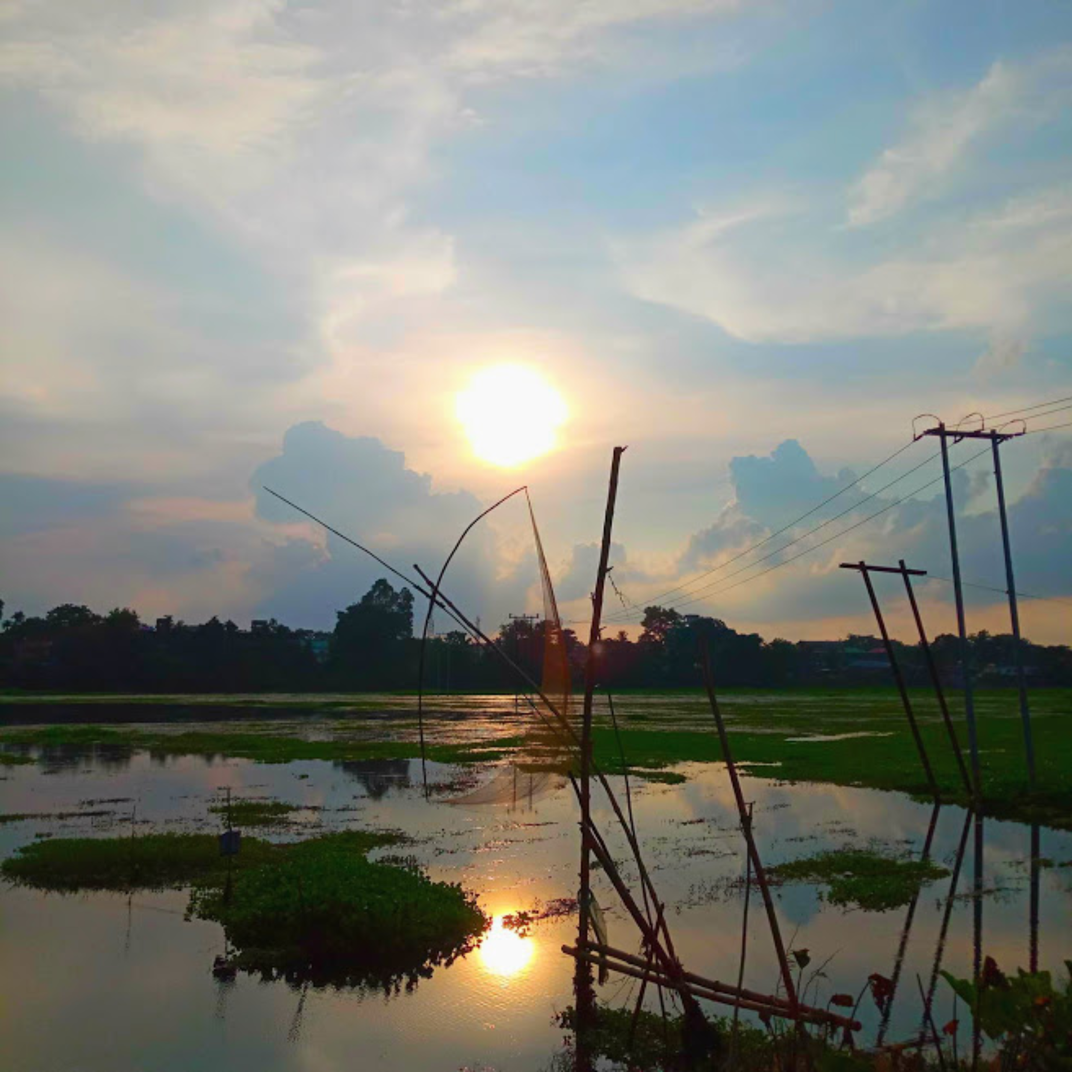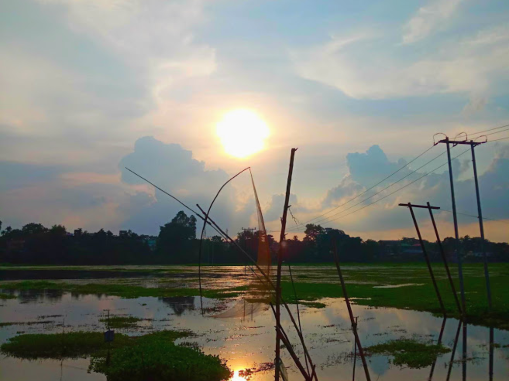 This is a scene of the setting sun over a small river, Giabhorali, nearby Tejpur town in the state of Assam in India. The sky was somewhat cloudy and the sun was visible. The reflection of the sun was focused on the water exactly in between some floating lump of waste materials and a fishing net kept ready for a catch. It’s really a wonderful sight. The shadow of the landmass across the river and of the floating materials are very clearly visible. When you watch carefully, even the movement of the water flowing is in your sight. The road goes by the side of the river and I was walking on it.