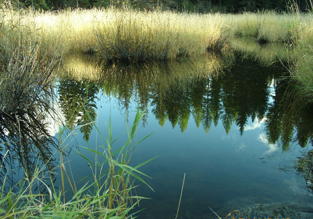 Perfect reflection of the shrubs and trees on a beautiful day in the Swan Mountains of Montana.
