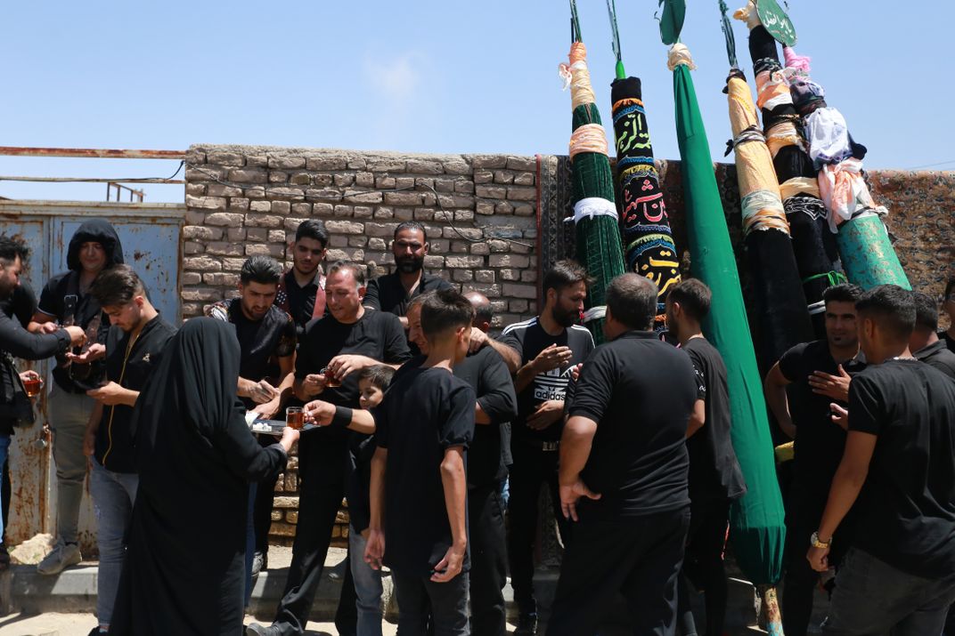 This is a mourning ceremony for Imam Hussein in a village in Iran, and in this image, people are resting after the procession with tea.