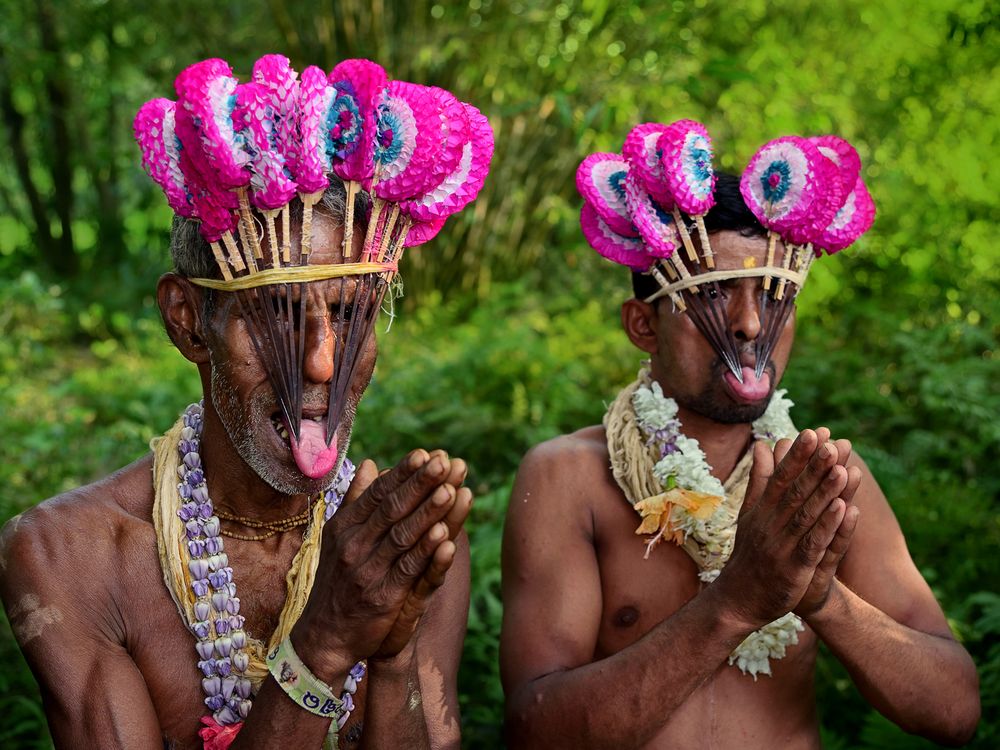Devotees in elaborate traditional headgear and floral garlands perform a ritualistic expression of devotion during a tribal festival in India. Their pierced tongues and intense facial adornments reflect a deep spiritual commitment and centuries-old customs preserved within indigenous communities.