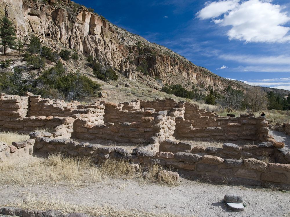 Remains of an ancestral American pueblo in what is now known as Bandelier National Monument. The original dwelling was three stories high and housed a population of about 400. Hiking Bandelier provide