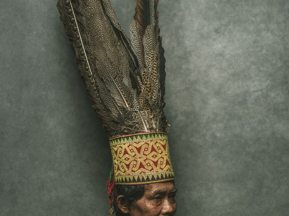 Remang, a Dayak Iban from the Pelaik Village Long House, wears a “lelanjang” headpiece with Argus bird feathers. Shot in West Kalimantan, Borneo Indonesia