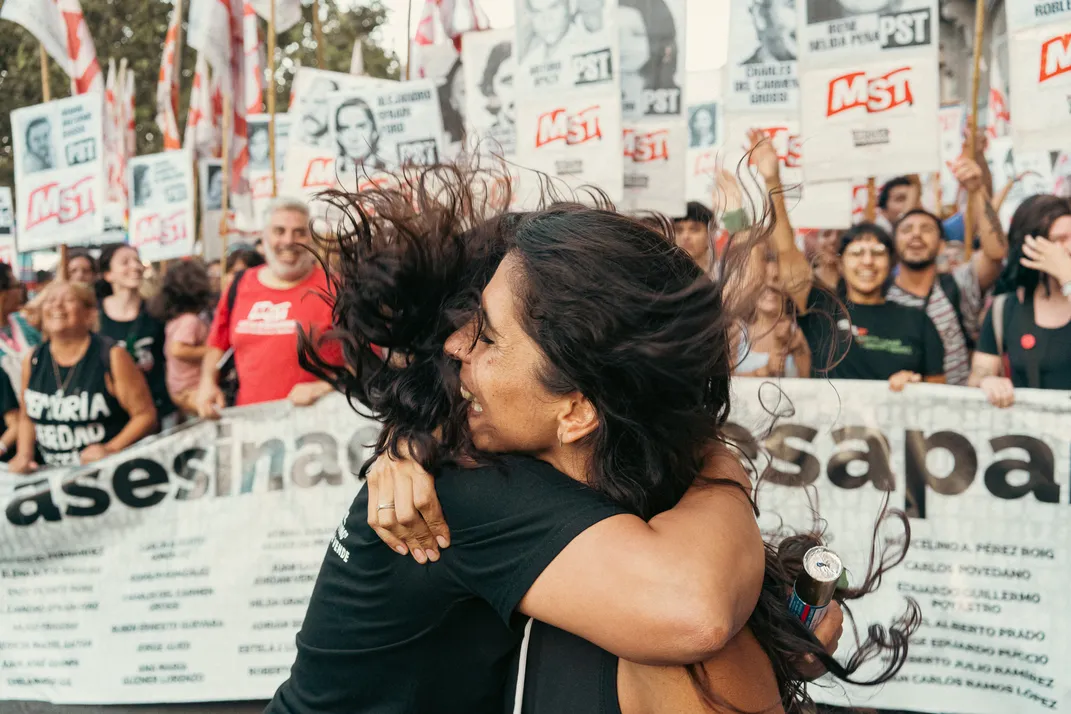 Two friends hug at the march for the National Remembrance Day in Argentina, March 24.