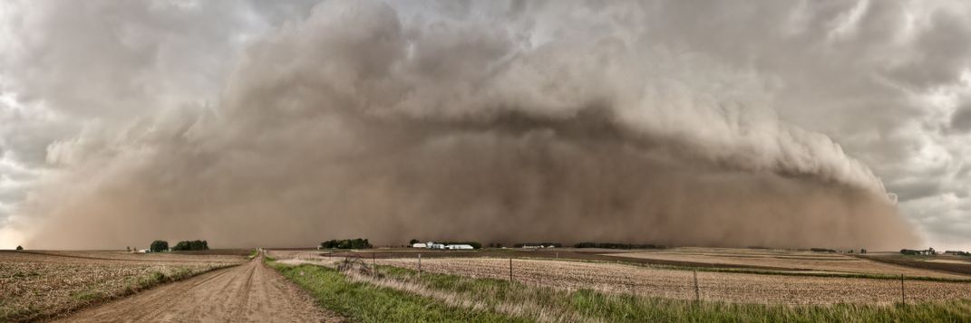 Reminiscent of the dust bowl era, a dust storm (or haboob) from a severe warned thunderstorm rolls over the hills near Sioux Center, Iowa.
