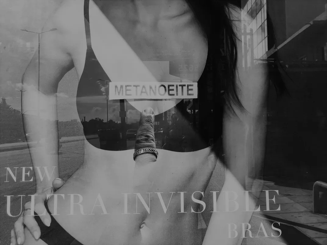 In the final photo, I have combined 2 photos. The basic was taken at a bus station. There was a poster for an underwear company. On the breast of the model, someone had put a sign saying "Repent". On the mirror, it is reflected the traffic of the road. People pass by, people waiting, life moves. I thought the person who put the sign on the poster maybe wanted to alert people of the real meaning of life which comes from the change in human thinking and acting. It is like he wanted to say that we, people can do more than consume constantly and find happiness beyond chasing material needs. The second picture is my finger wearing a ring with Jesus prayer. I wanted to emphasize the message of the sign on the poster.