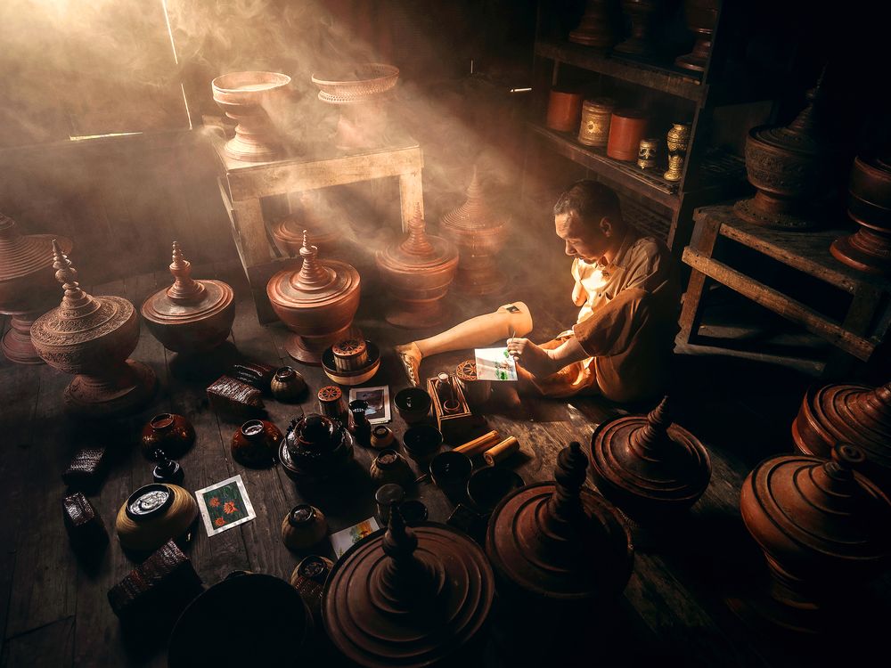 In a quiet lacquerware workshop, an artisan works steadily as beams of morning light cut through the smoky air. Surrounded by handmade vessels, he continues a craft passed down through generations — a quiet portrait of resilience and devotion.
