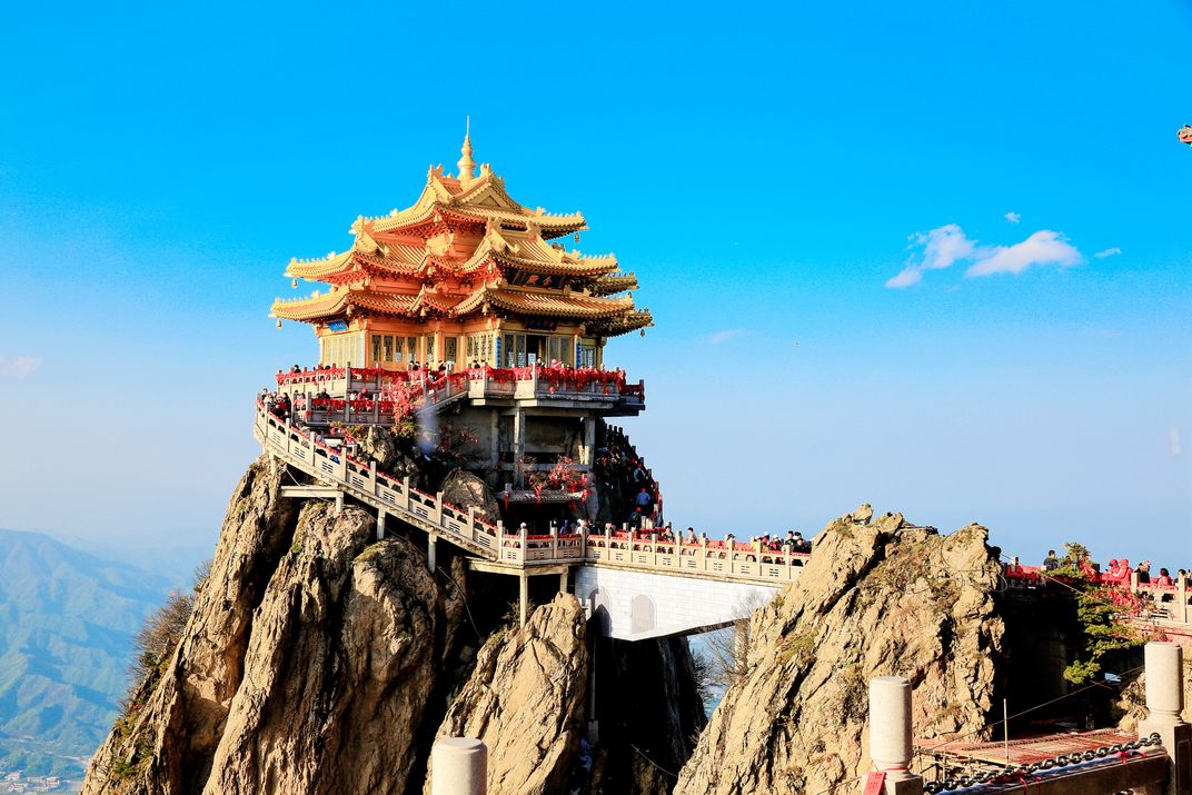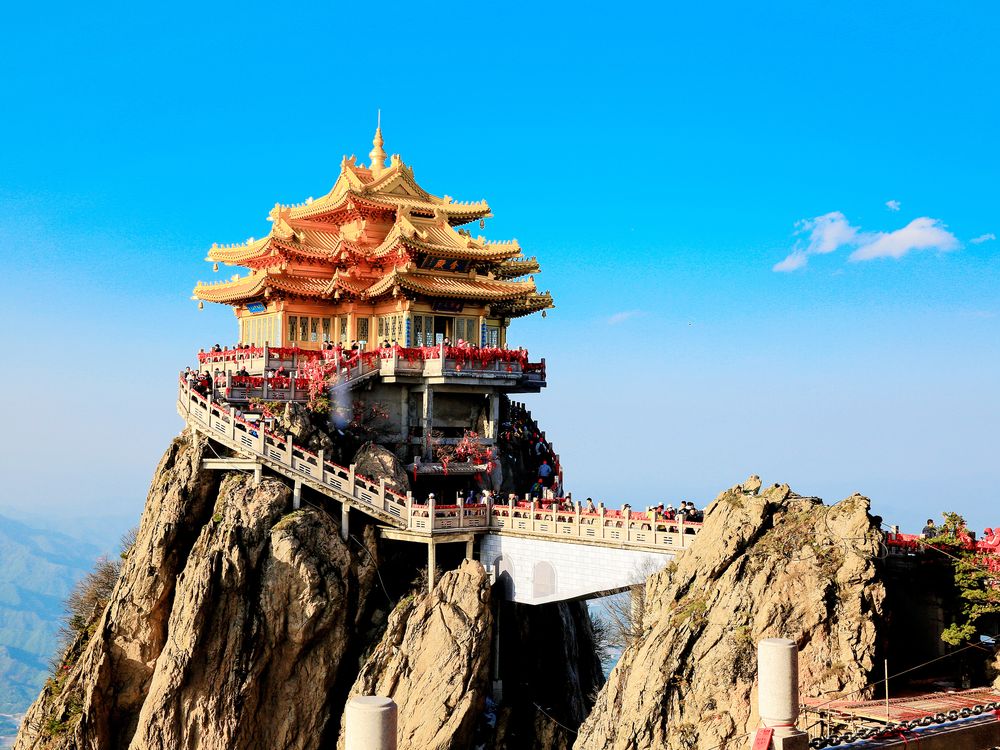 Gilded halls perch atop perilous peaks, with walkways winding along steep cliffs. Red silk and visiting crowds add a touch of earthly vitality to this ethereal mountain setting.